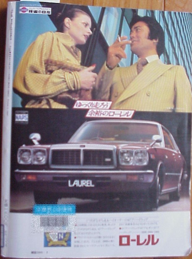 裏表紙は日産ローレルです。フェンダーミラーとか広告の字体とか、左上の「技術の日産」というキャッチフレーズに昭和を感じます(^^;)