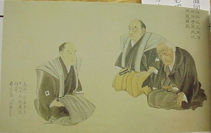 右は晩年の頃の静山(一番右側の隠居姿の老人)+真田幸貫(真ん中)+大関増業。天保10年(1830年)に徳川斉昭がこの3人を水戸藩邸に招待し、その宴席でお抱えの絵師に書かせた物という。この3人はそのころ「3名君」として知られていて、斉昭もあやかりたかったらしい…。まあ静山の子沢山にはあやかったかも知れませんね、斉昭ヾ(--;)