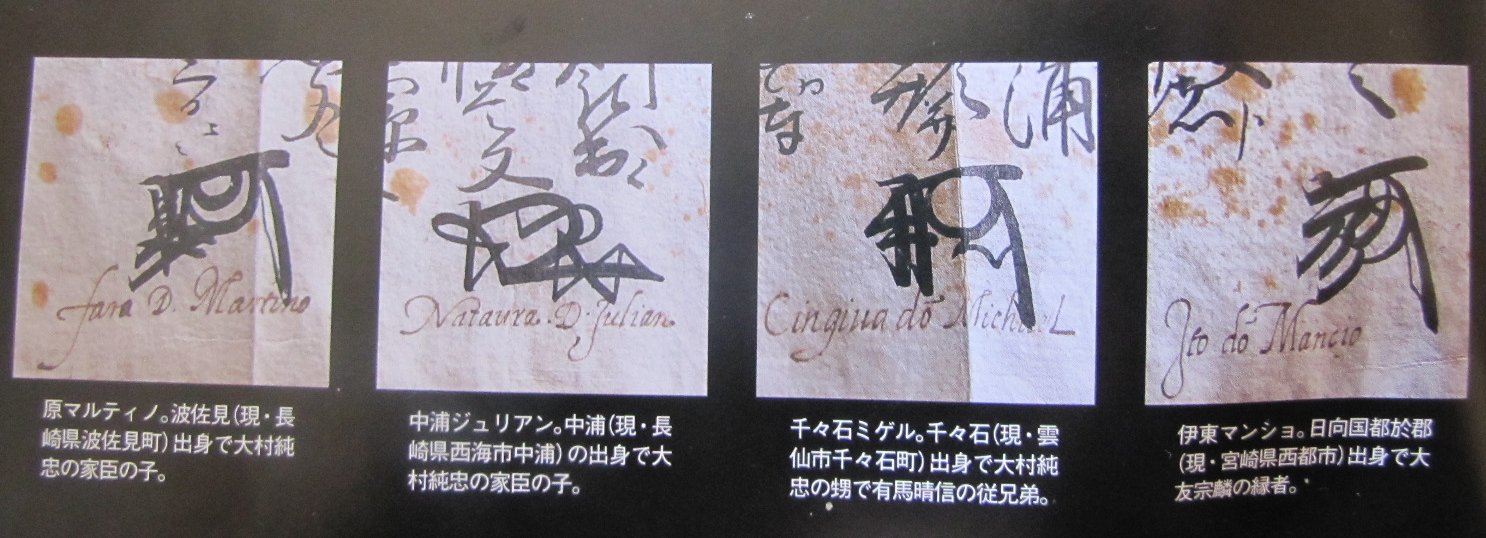 使節4人の花押。それぞれの出身士族と関係ある形なのか、実は有馬氏や伊東氏の花押は全く詳しくないので気になる。御教示お待ちしてます<(_ _)>