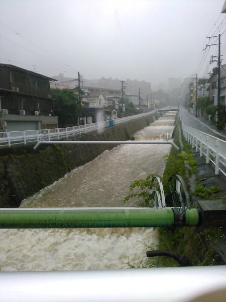 大雨の中ちらっと外を見に行ったら、いつもはちょろちょろの川が深さ半分のとこまで増水して、ものすごい激流になってるし、側溝の蓋から水が噴水のように湧いてた(○。○)
