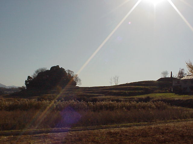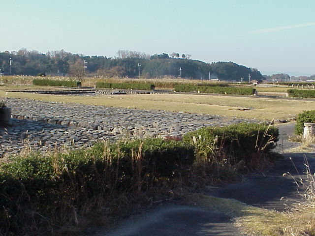 2001年拙撮影 手前の敷石が伝板葺宮跡で、奥に見える丘が今回方墳が見つかった養護学校の北にある甘橿丘